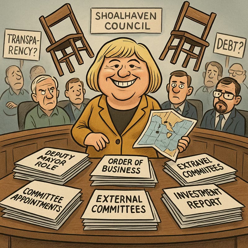 At the September 23, 2025 Ordinary Meeting, councillors will consider a series of reports prepared by the Director of City Performance. At first glance, these papers look like routine governance housekeeping. But look closer, and you see the outlines of political strategy, risks to council’s bottom line, and opportunities being created for the Mayor’s profile — both inside and outside Shoalhaven.