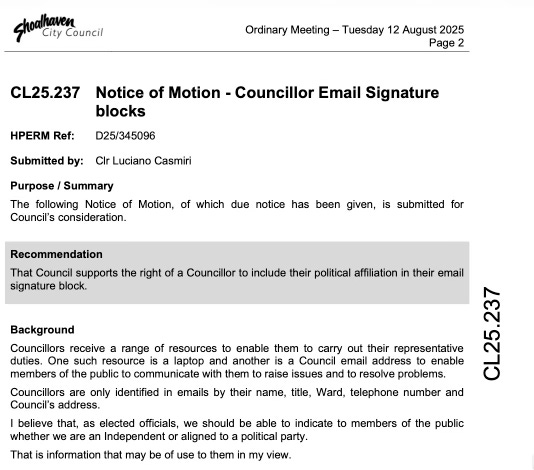 At the 12 August 2025 Ordinary Meeting, Shoalhaven Councillor Luciano Casmiri — a declared member and official of the Shoalhaven Independent Group (SIG) a registered political party in the state of NSW— has put forward a motion that’s both absurd and deeply revealing.
