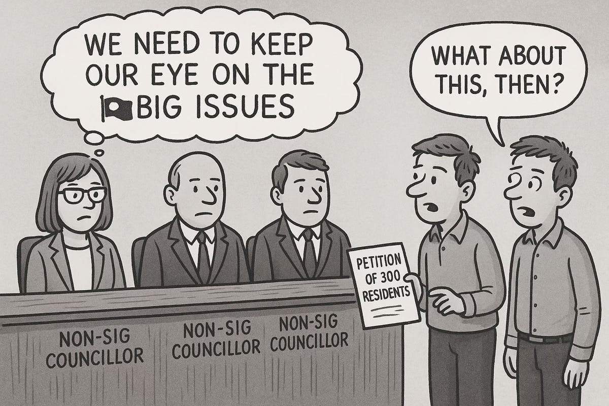 When councillors sit silent on procedural matters, especially when residents’ rights are at stake, they send an unintentional message: that small injustices can be overlooked if bigger issues are in play. That is not good enough. The non-SIG councillors let down 300 residents who signed that petition, to have it removed by the mentally challenged Kemp.