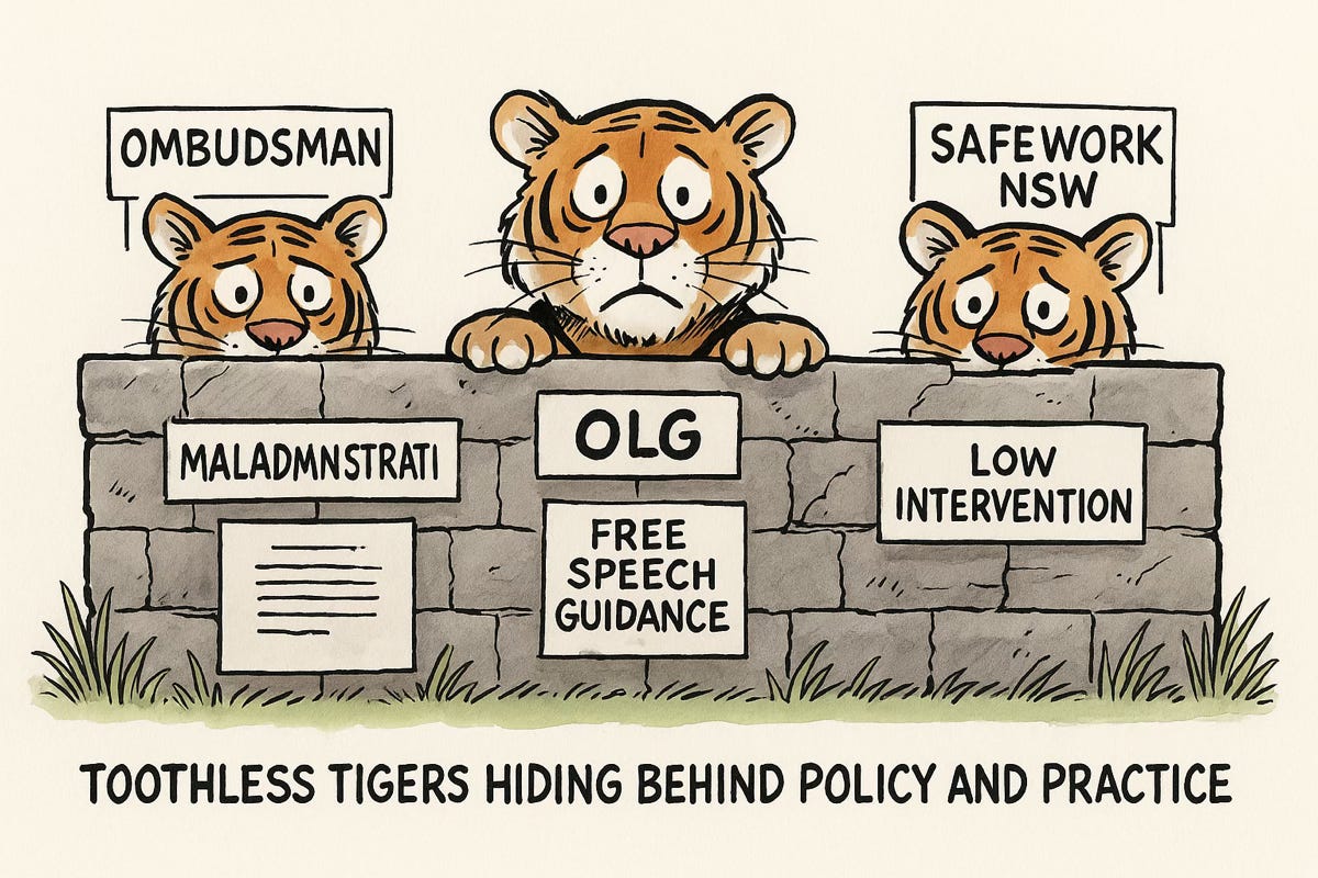 It appears state regulators do not want to act on bad behaviour in councils because the system is designed to avoid intervention. The OLG narrows accountability under the guise of free speech. The Ombudsman defers to councils. ICAC sets the bar impossibly high. SafeWork often triages complaints away.